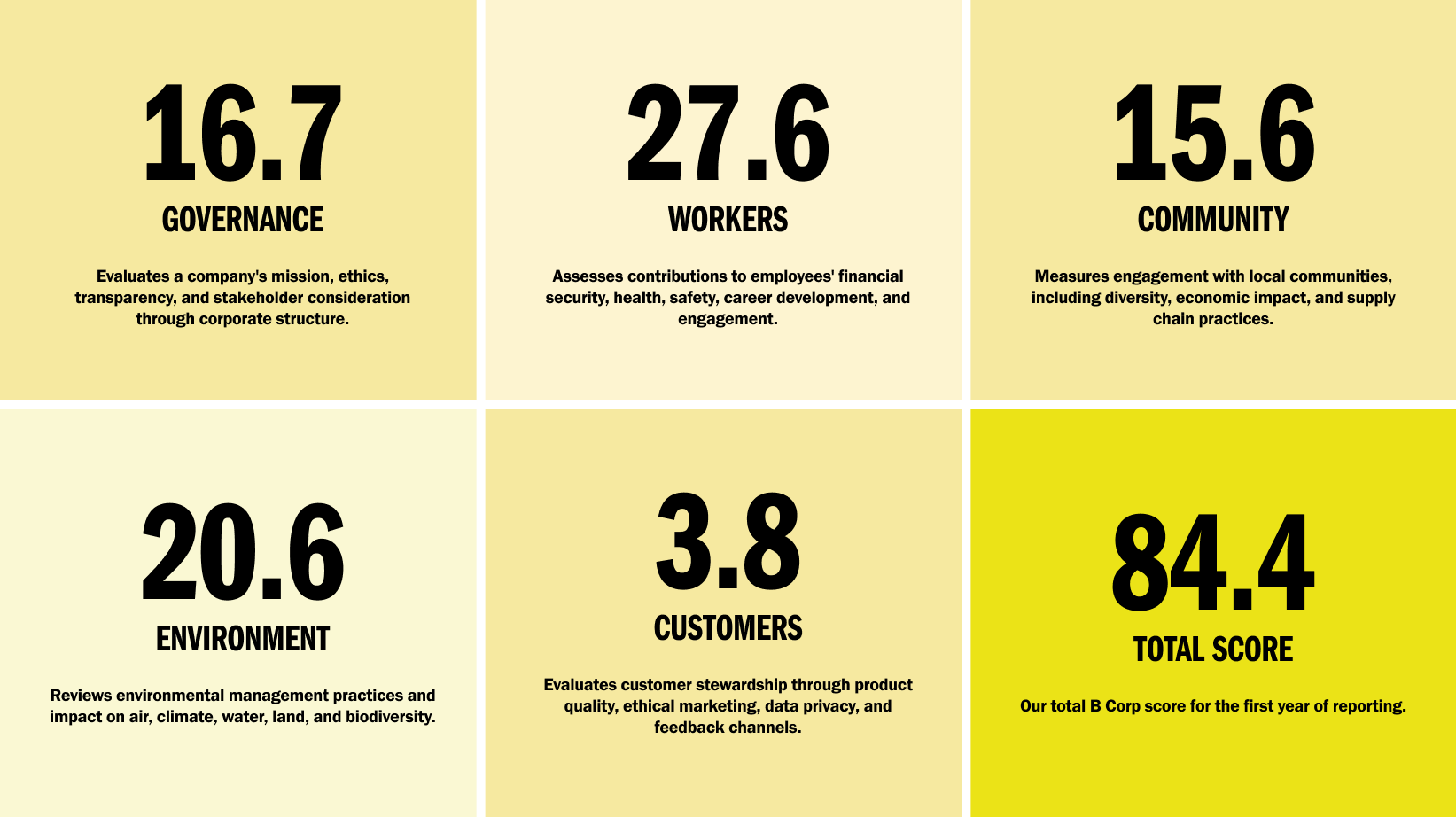 B Lab’s verification process took place in May and June 2024. We achieved a final assessed score of 84.4 points in August 2024, setting a baseline for our impact. This is a robust score, above the median score of 50.9 points for ordinary businesses. Knowing where we stand has provided us insight into where we can do better as we prepare to respond to the new B Corp standards issued in April 2025.