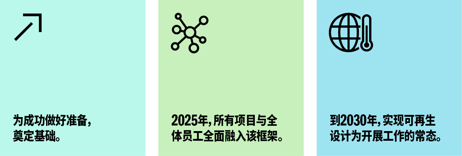 《可持续设计框架》中设定的目标明确了我们的愿景,以及在三个清晰的发展阶段中实现的成果: