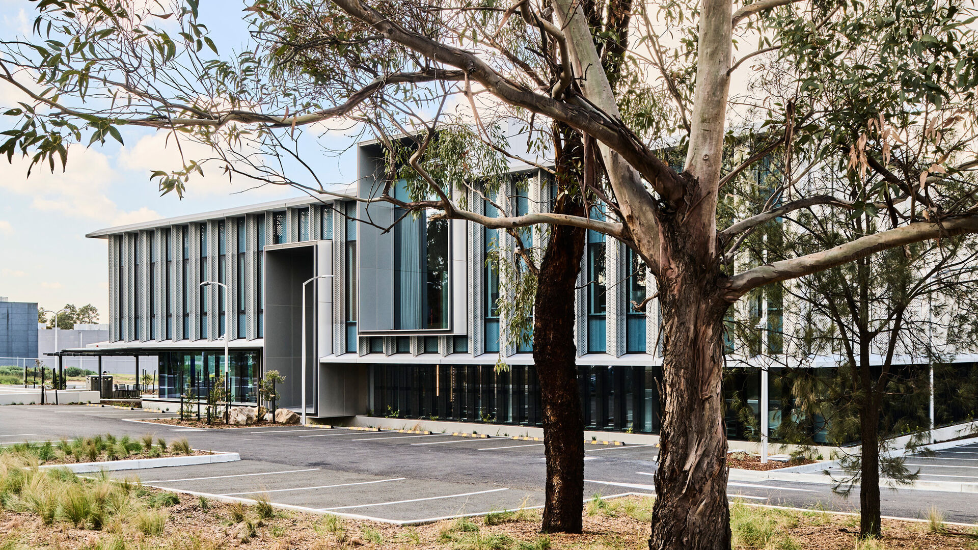 With an expressed second-level volume, the building combines precast concrete with glass reinforced concrete (GRC) elements that frame a glazed aluminium curtain wall, creating a façade designed for both performance and expression. Sculpted vertical aluminium sunshades temper Melbourne’s afternoon sun, while large windows connect the interiors with the surrounding mature trees and landscape.