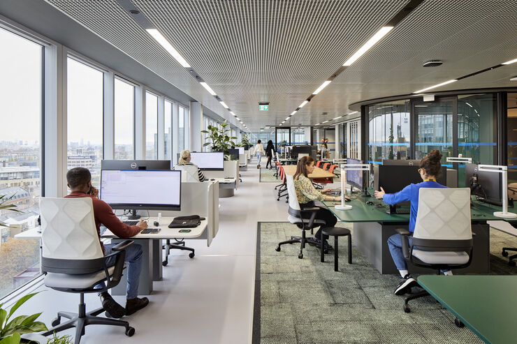 The middle zone functions as a shared coworking space for all employees with work lounges, meeting areas, drop-in workspaces, focus rooms for video calls, and an 80-person town hall space. Equipped with occupancy sensors and accessed via an online booking system, it’s ideal for inter-office meetings or as a temporary workspace between city appointments.