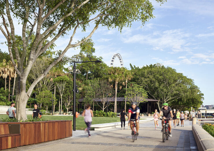 - 河畔草坪 – 设计新增了重要的绿色滨水空间,紧邻布里斯班市中心黄金地段。在草坪上可以看到河景和整个南岸公园的景色,这里全天候开放给市民休闲、野餐或举办特别活动。