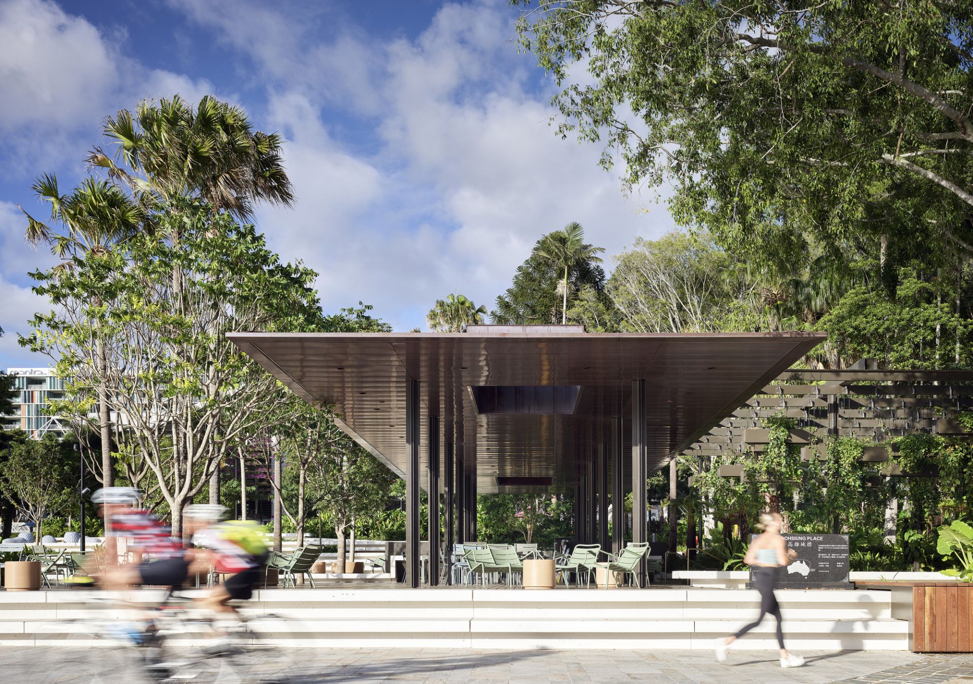 - 雨林平台和凉亭 – 顺应布里斯班当地气候设计的一处社区友好空间,让人仿佛置身热带雨林之中。凉亭使用的古铜色饰面,和热带雨林的设置形成互补,营造出更具质感的隽永空间,加强城市感。户外家具和公共烧烤台均可移动,供日常及活动使用,可轻松地从餐厅转变成舞台设置。