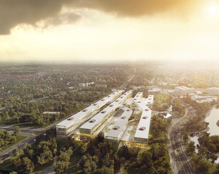 如同城市设计以公园和花园的绿植点缀衬托周围的建筑,办公楼内三五成簇的悬挂盆栽和静立地面的绿树嵌入并烘托了室内景观。
