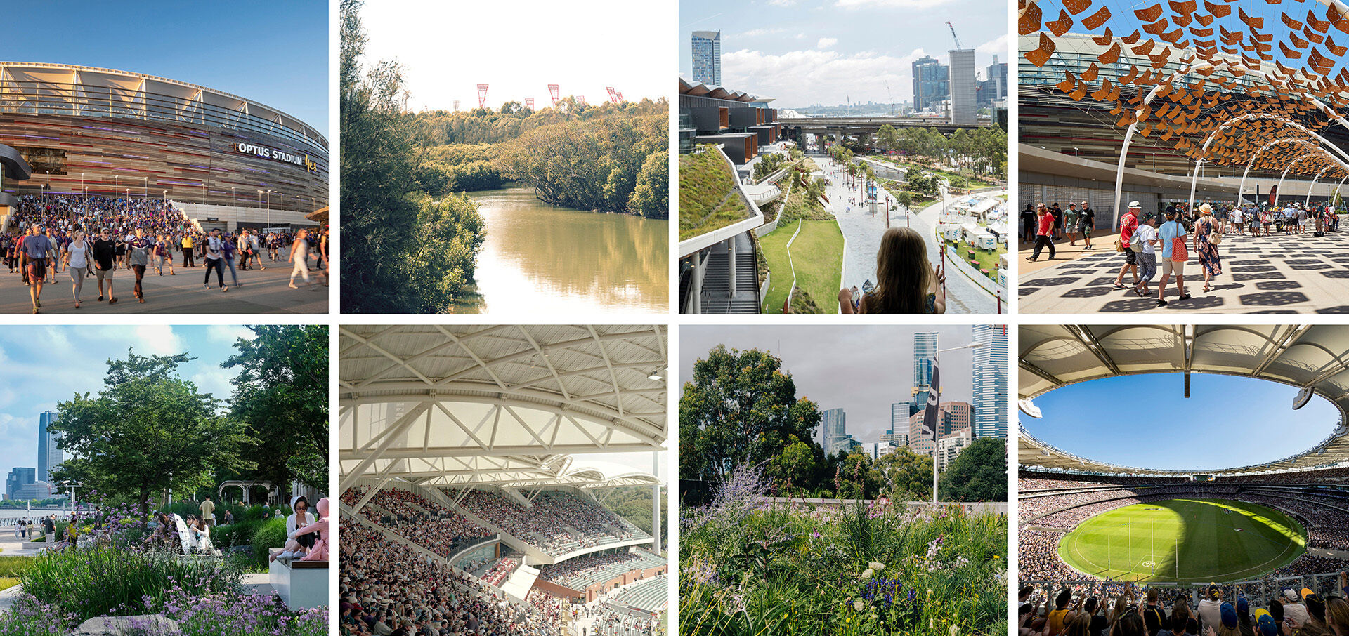 Top, left-to-right: Optus Stadium, Perth. Photography by Peter Bennetts. Sydney Olympic Park. Photography by Max Creasy. ICC Sydney. Photography by Brett Boardman. Optus Stadium, Perth. Photography by Peter Bennetts.
