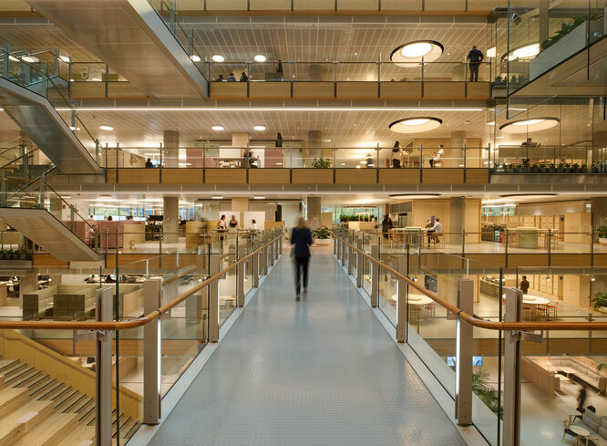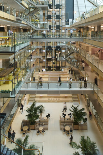 The central plaza concept of each building is unique to CBA. The base of each atrium presents an interactive hospitality experience with healthy food offerings, comfortable workspaces, function and client meeting spaces, and wellness facilities. The design encourages employees and guests to pass through these hospitality areas when entering the workplace, immersing them in the distinct CBA experience. Now, an urban village of activated social, work and community destinations has been established to foster more genuine connections for employees and visitors alike.