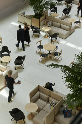 Home-like qualities, including access to gardens, green spaces and dedicated wellbeing zones, form part of CBA’s urban village. The entire perimeter is lined with planting designed to grow as the building ages, evoking a sense of calm and reprieve. Throughout the space, indirect soft lighting technology is utilised, providing warmth and comfort to sightlines. This simple yet innovative approach contrasts with traditional direct lighting specifications and has significantly transformed the workplace atmosphere. The overlay of domestic qualities integrated within joinery, scale and furniture brings a welcomed level of comfort and approachability. Overall, the material palette forms a natural backdrop to the hive of activity, creating a sense of calm, timelessness and tactility which blends seamlessly into the base building.