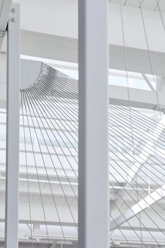 A central, 14-metre-long steel bridge connects the social heart with the work areas, mirroring nearby bridges that connect the urban environment into the surrounding parkland.