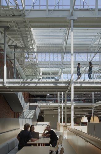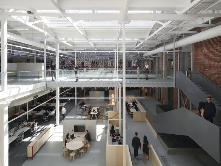 Integrating a large and previously very dark wool mill and an existing 1980s building opens up a new three-level, 7,000 m² workplace. Distinct zones, each with its own identity and function, are unified by a central social area designed for connection and drop-in working. Natural light suffuses the spaces, which is filtered throughout the building via a large central skylight.