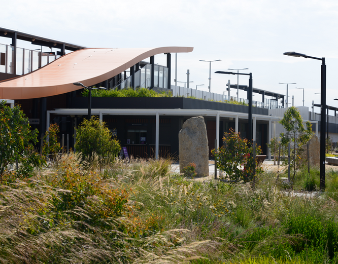 - Strategically positioning three giant granite boulders to represent the once prominent mountain landmarks of You Yang’s, Mt. Disappointment, and the Macedon Ranges. These landmarks — now barely visible behind new houses — are significant as creation stories and were once used for navigation on the flat grassland plains. They are now subtly referenced in the design.