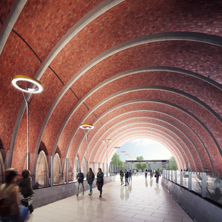 The entrance will feature 15 soaring brick arches, which are being built off-site and will be delivered to the station and installed over the coming months.