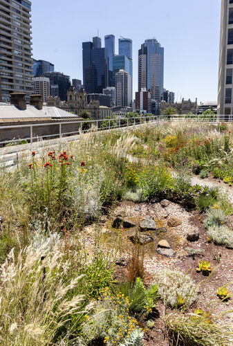 The garden was deliberately designed to measure the ecological and climatic benefits of biodiverse plantings — habitat creation, biodiversity support, stormwater retention, and cooling performance can all be tracked. Researchers from the University of Melbourne’s Green Infrastructure Research Group are testing different green roof types, assessing their costs and performance for at least 12 months. The insights will help break down industry barriers and make green roofs more accessible for future projects.