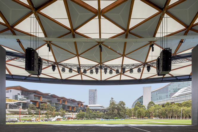 Integrated within Tumbalong Park, Tumbalong Green Sound Shell hosts concerts, festivals, sporting events and community gatherings year-round. The striking timber grid-shell canopy creates a dynamic, light, open space that provides enhanced weather protection to the stage, with upgraded sound and lighting system enables hosting of a full spectrum of high-quality events.