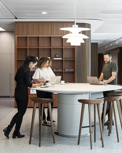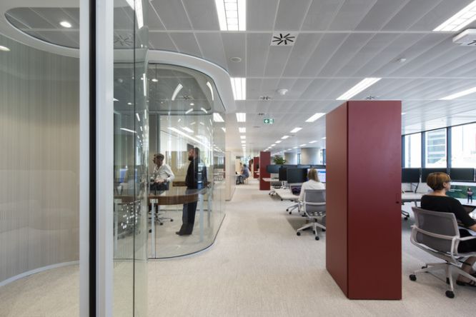Teams now work in small ‘neighbourhoods’, while groups that require separation – due to regulations – have their own zones, buffered by support functions to protect confidentiality.
