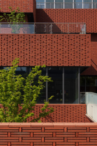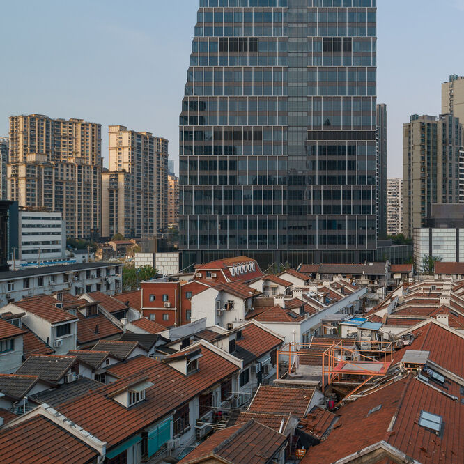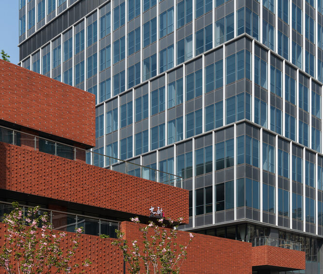 Faced with the challenge of bridging the vast scale difference between the office tower, the retail district and various urban areas, our design team drew inspiration from the neighbourhood’s historic Shikumen housing. This architectural vernacular is subtly reimagined throughout the development, from the dynamic, lattice pattern that animates the tower’s podium façade to the more intimate, textured brickwork.