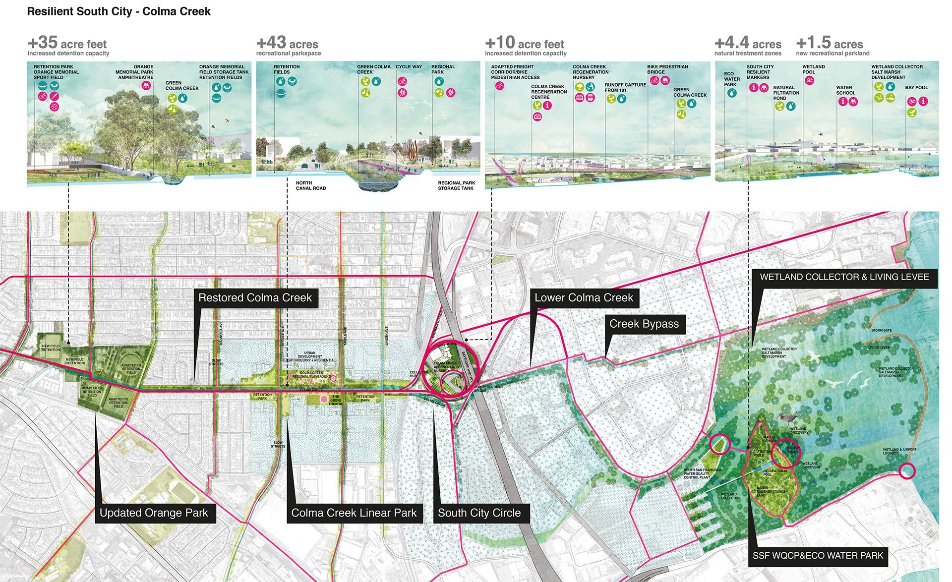 Taking our cue from these historic and current patterns of use, we proposed a new network of parklands and public spaces to connect and collect people and water – both before and during times of disaster – within three communities: East Oakland, Redwood City and South San Francisco.