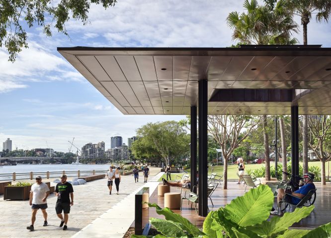 - The rainforest deck and pavilion - a sheltered and welcoming place designed for Brisbane’s climate, where the community can enjoy the river view while nestled in a shaded rainforest setting. The pavilion’s elegant copper skin complements the rainforest setting, and brings durability and timeless appeal to highlight the civic function of the space. With moveable furniture and communal barbeques, these democratic spaces adapt from everyday use to events mode, transformed into a dining room or stage.