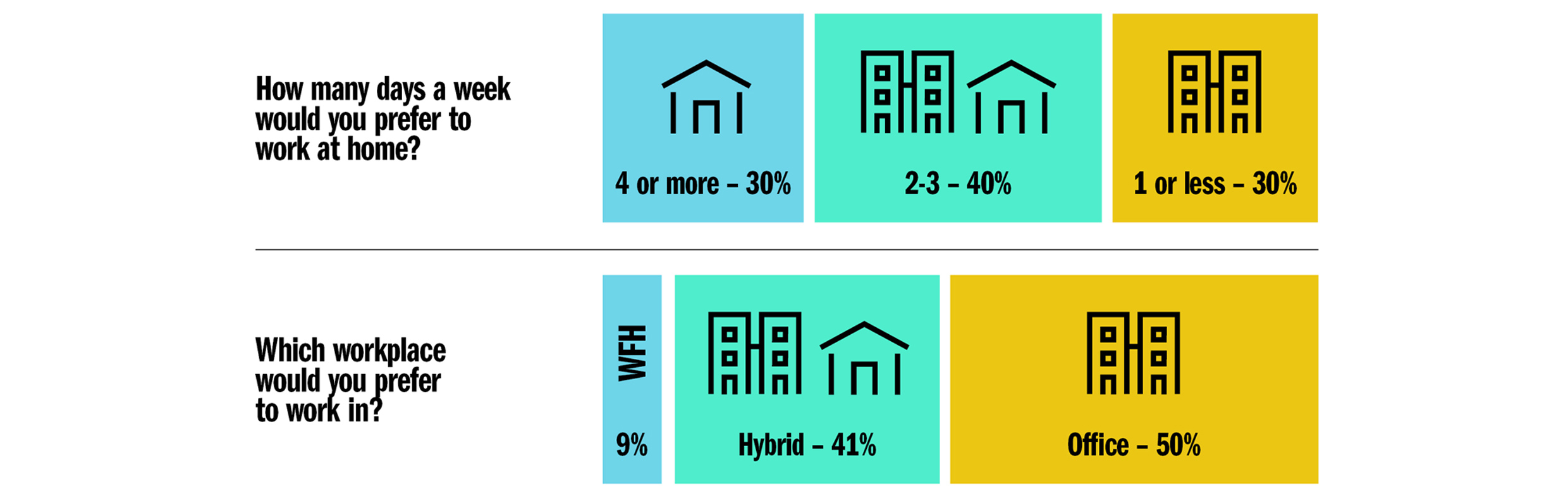 These questions focus on past behavior, so they’ll give you a reasonably accurate picture of how people are splitting their time between the home and the office. Using this data, you’ll be able to work out where people are predominantly working.