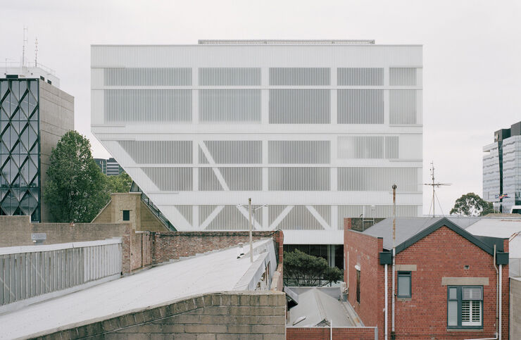 An eleven-metre-tall curtain glass wall abuts the footpath of Anzac Parade, capped in modernist style with a skillion roof. Inside, a suspended, cylindrical centrepiece wraps the 730-seat Parade Theatre in a veil of louvres that cuts up through the ceiling to drink in the sky. The project was environmentally engineered to facilitate the lowest life cycle operating costs while ensuring acceptable comfort conditions are maintained year-round.